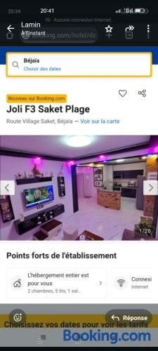 Saket plage, Bejaïa şehrinde bulunan bir tesistir. Bu daire tipi tesiste konaklayan konuklar; ücretsiz WiFi, balkon ve tam donanımlı bir mutfaktan yararlanabilirler.