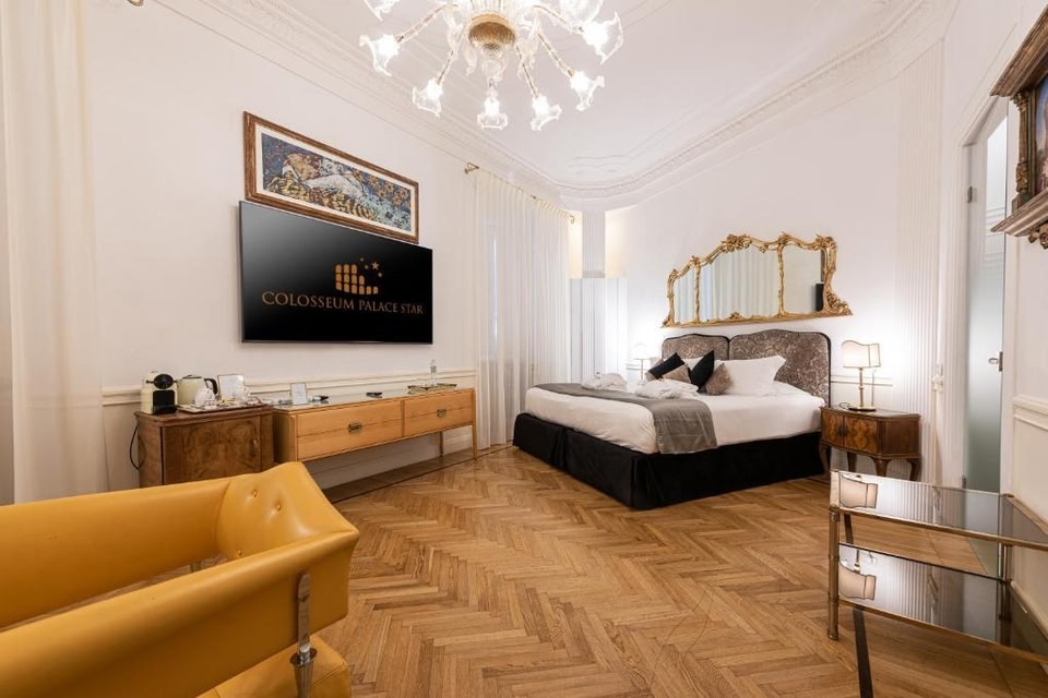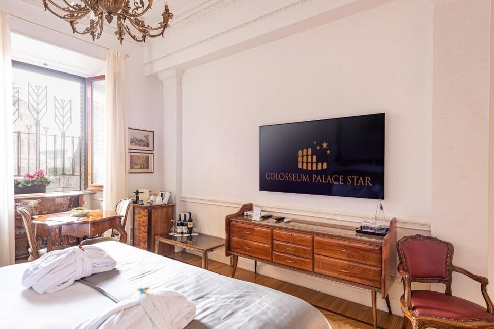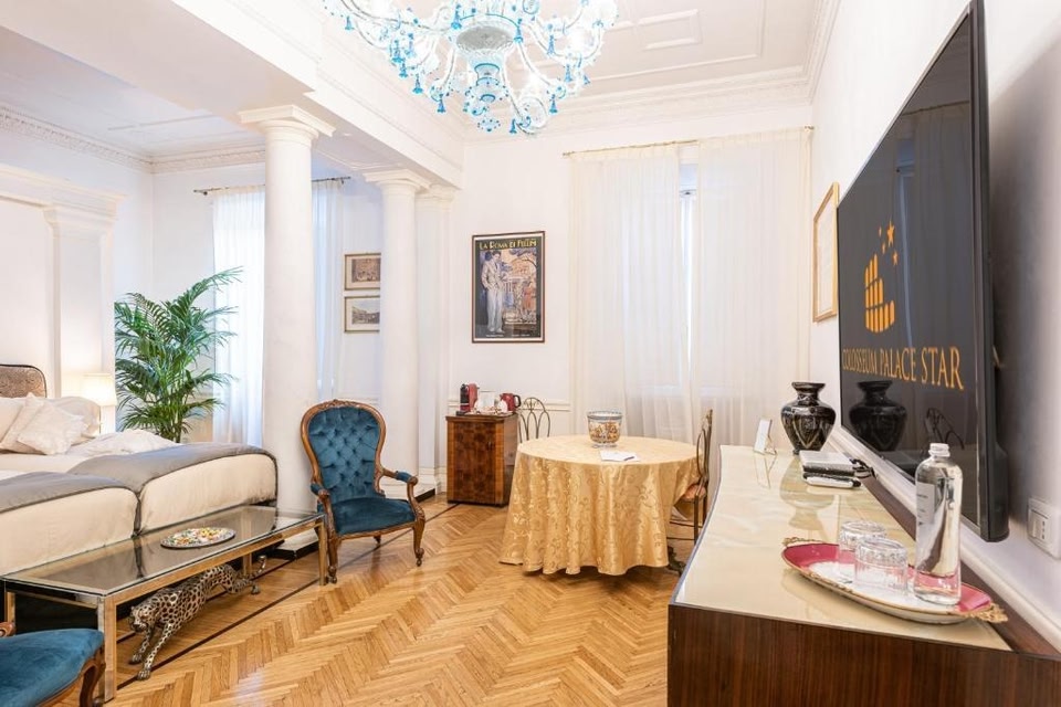 Location : With a stay at Colosseum Palace Star in Rome (Monti), you'll be within a 5-minute walk of Roman Forum and Colosseum. This townhouse accommodation is 0.6 mi (1 km) from Via Nazionale and 0.6 mi (1 km) from Piazza Venezia. Amenities : Make use of convenient amenities, which include babysitting/childcare (surcharge) and tour/ticket assistance. Attractions : Distances are displayed to the nearest 0.1 mile and kilometer. Roman Forum - 0.3 km / 0.2 mi Golden House of Nero (Domus Aurea) - 0.3 km / 0.2 mi Colosseum - 0.3 km / 0.2 mi Arch of Constantine - 0.5 km / 0.3 mi Basilica di San Clemente - 0.5 km / 0.3 mi Santa Francesca Romana - 0.6 km / 0.4 mi Santa Prassede - 0.9 km / 0.6 mi Trajan's Forum - 0.9 km / 0.6 mi Trajan's Market - 0.9 km / 0.6 mi Via Nazionale - 1 km / 0.6 mi Palazzo Valentini - 1 km / 0.6 mi Basilica di Santa Maria Maggiore - 1 km / 0.6 mi Piazza Venezia - 1 km / 0.6 mi National Monument to Victor Emmanuel II - 1.1 km / 0.7 mi Capitoline Museum - 1.1 km / 0.7 mi The nearest airports are: Fiumicino - Leonardo da Vinci Intl. Airport (FCO) - 29.9 km / 18.6 mi Ciampino Airport (CIA) - 27.1 km / 16.9 mi The preferred airport for Colosseum Palace Star is Fiumicino - Leonardo da Vinci Intl. Airport (FCO). business_amenities : Featured amenities include multilingual staff, luggage storage, and laundry facilities. A roundtrip airport shuttle is provided for a surcharge (available 24 hours). Dining : A complimentary local cuisine breakfast is served daily from 8:00 AM to 10:00 AM. HeadLine : Near Colosseum Rooms : Make yourself at home in one of the 4 individually decorated guestrooms, featuring espresso makers and flat-screen televisions. Your Select Comfort bed comes with Frette Italian sheets. Complimentary wireless Internet access keeps you connected, and satellite programming is available for your entertainment. Private bathrooms with showers feature rainfall showerheads and complimentary toiletries.